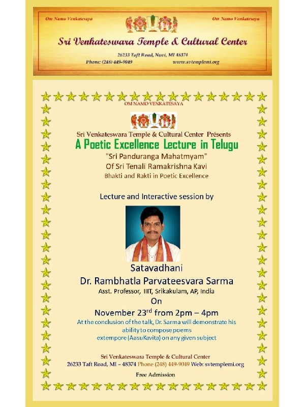 నవంబరు 23న - USA మిచిగన్ రాష్ట్రం, డెట్రాయిట్, నోవై వేంకటేశ్వర స్వామివారి దేవాలయంలో - "పాండురంగమాహాత్మ్యం - భక్తి" సాహిత్య-అధ్యాత్మిక ప్రసంగం బాగా జరిగింది. ఆశుకవితా ప్రదర్శనం కూడా ఏర్పాటు చేసారు.